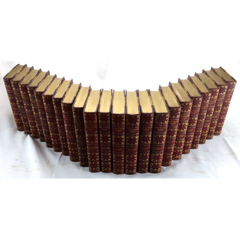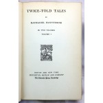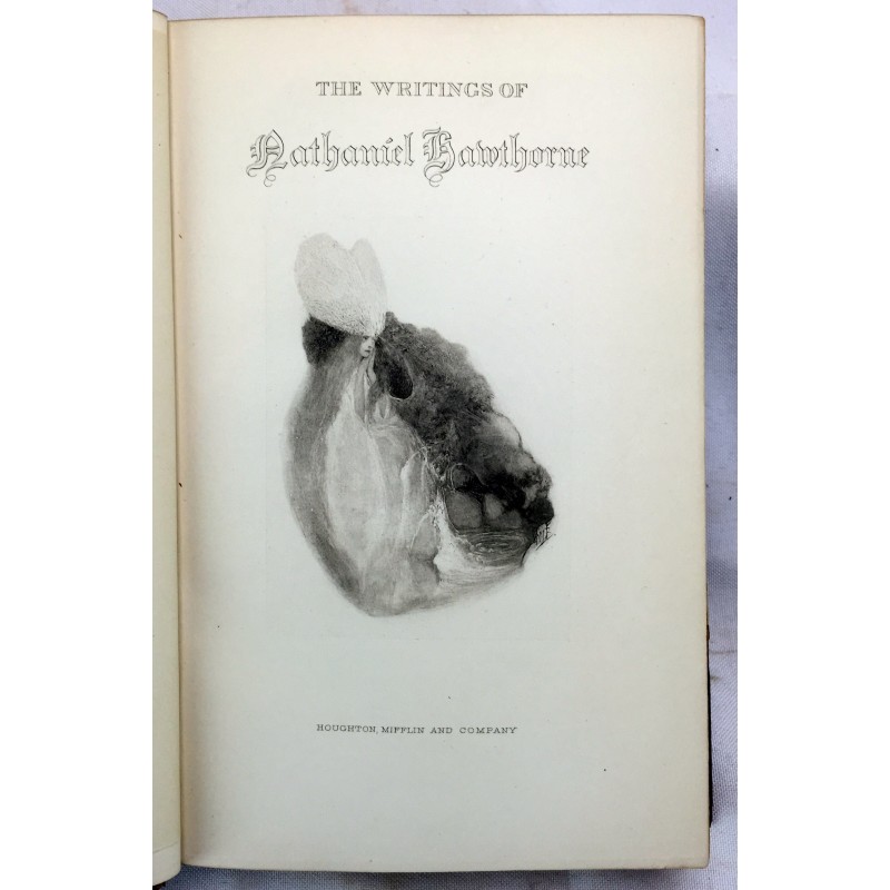 22 octavo volumes. Old Manse edition. Original 1/2 red leather over marbled boards, raised bands, gilt, top edge gilt, marbled endpapers. Light rubbing, slight darkening to edges. Crisp and clean internally. A near fine set of Hawthorne's work. Contents: v. 1-2. Twice-told tales.--v. 3. Snow-image. --v. 4-5. Mosses from an old manse. --v. 6. The scarlet letter. --v. 7. House of seven gables. --v. 8. Blithedale romance. --v. 9-10. Marble faun. --v. 11. Our old home. --v. 12. Grandfather's chair, etc. --v. 13. Wonderbook and Tanglewood tales. --v. 14. Dolliver romance. --v. 15. Dr. Grimshawe's secret. --v. 16. Tales and sketches. --v. 17. Miscellanies. --v. 18. The American notebooks. --v. 19-22. Notes of travel.